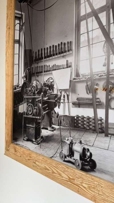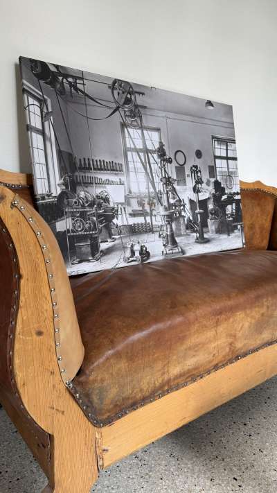 Eine besonders schöne Schwarz-weiß-Aufnahme von der alten Schmiedewerkstatt haben wir vom Heimatfotografen Stefan Lindauer in Oberstdorf vergrößern und auf Leinwand drucken lassen. Wer genau hinsieht, kann darauf zum Beispiel die schönen alten Fenster erkennen, die wir bei der Sanierung entdeckt und erhalten haben.