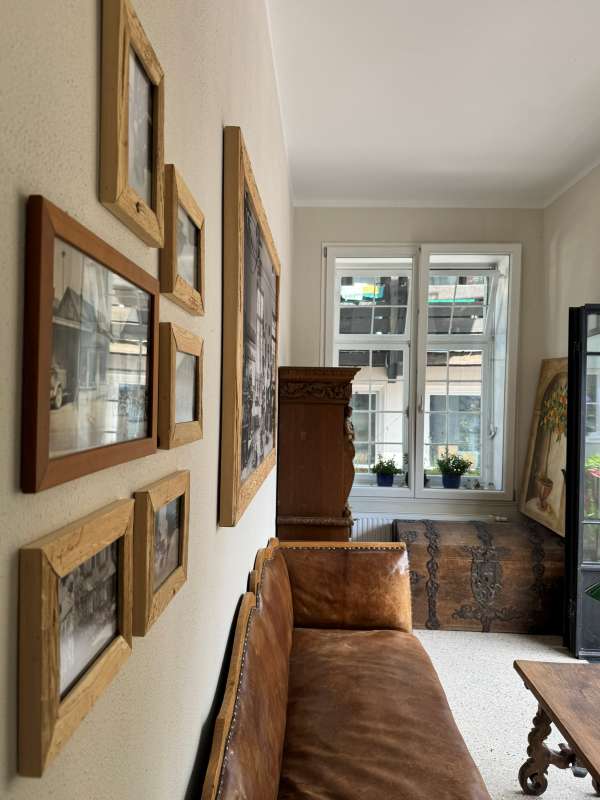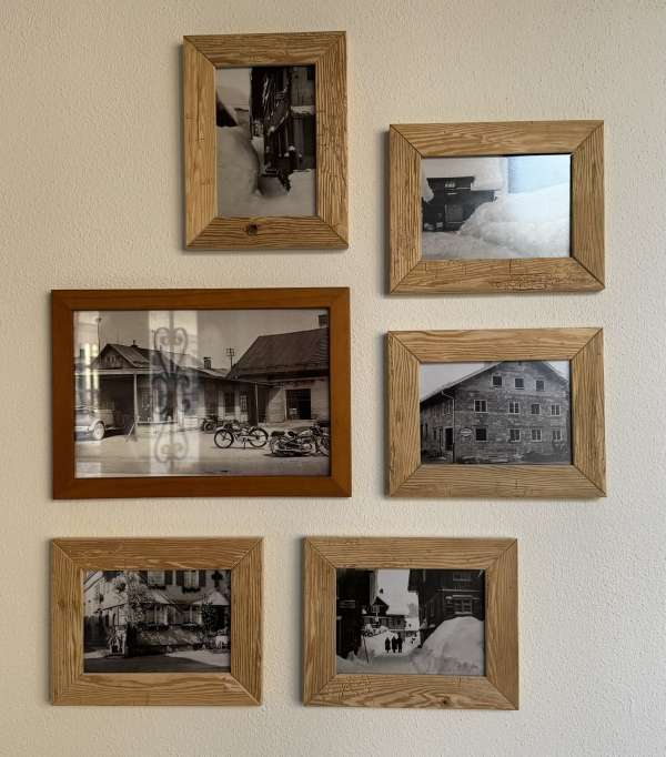 Voilà: Endlich hängen sie in unserer „Lounge“! Eine Auswahl historischer Aufnahmen von unserem Anwesen, die uns die Vorbesitzerin überlassen hat. Nach ihrer Familie ist es auch benannt: Die Einheimischen kennen es als „Pfeiffer-Haus“.