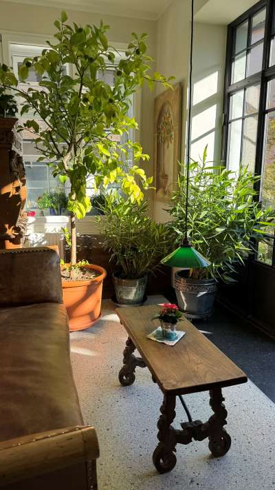 Im Winter rücken wir dann etwa zusammen. Dann holen wir unsere Kübelpflanzen vom Hof herein. Die Lounge wird zum mediterranen Wintergarten mit Zitronenbaum und Oleander. Auch schön!